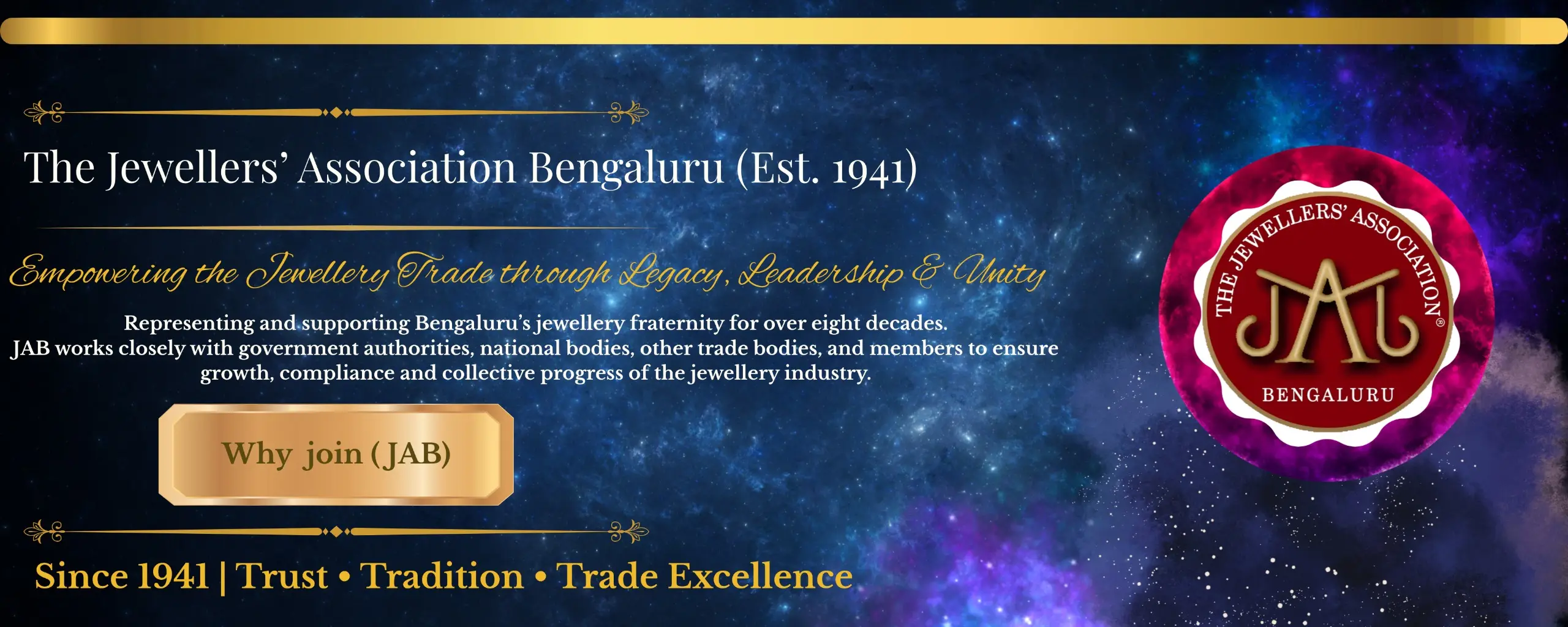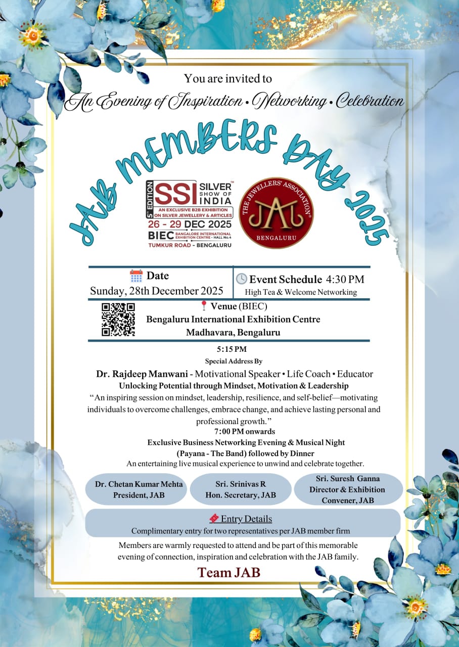 Traversing a commendable journey of 75 years, The Jewellers’ Association Bengaluru (JAB) is today a force to reckon with in the jewellery industry of Karnataka a vibrant society of jewellery industry professionals with well thought out objectives, clear vision, a bouquet of achievements and an indomitable team spirit.
